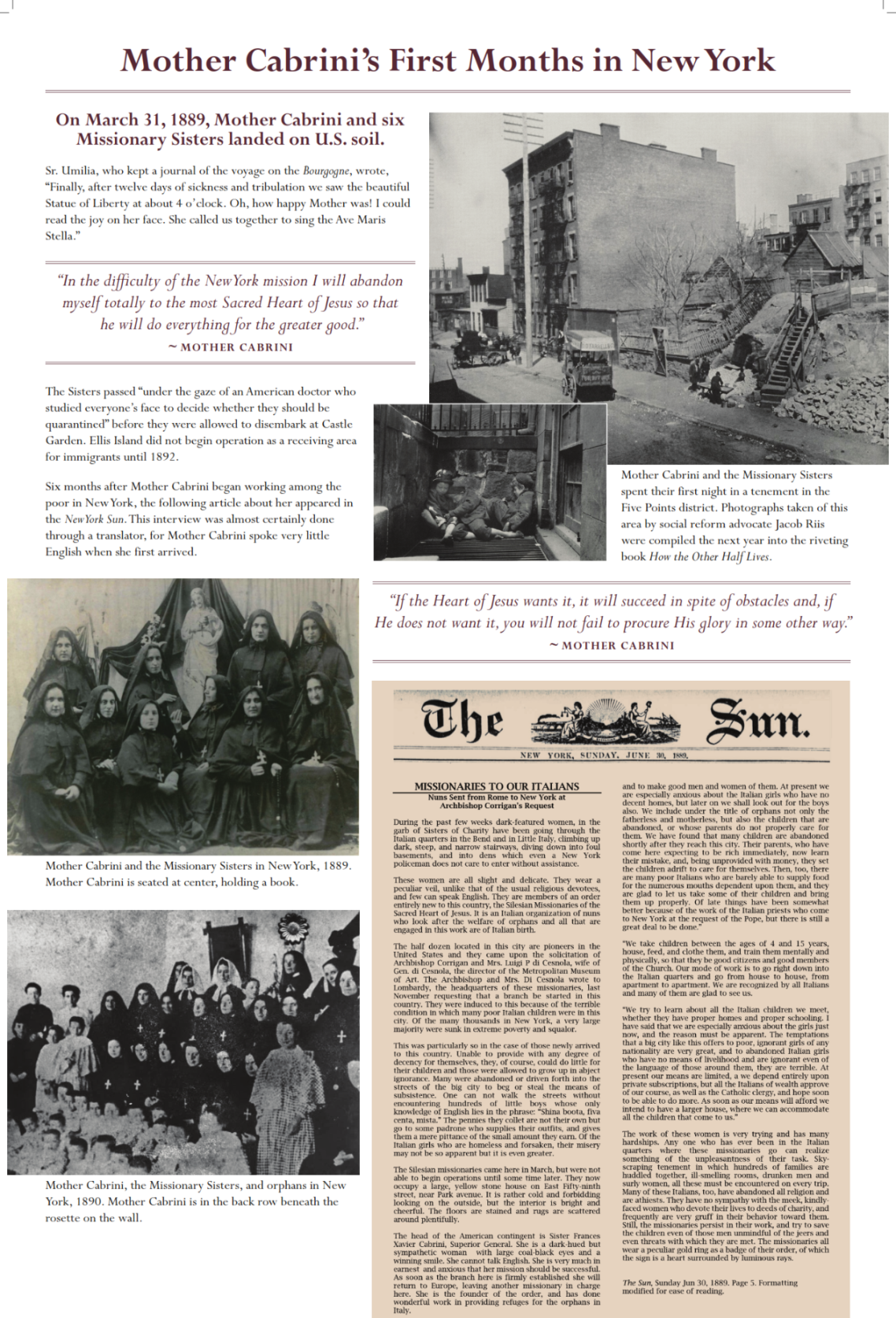 In 1872, after recovering from smallpox contracted while visiting the sick and the poor, she was asked to teach at a girls’ school. After six years of teaching, she followed the request of her bishop and founded the Missionary Sisters of the Sacred Heart to care for the poor children in schools and hospitals. She eventually came to the United States in 1889 at the urging of Pope Leo XIII. She was accompanied by six Sisters, and their mission was to work among the Italian immigrants of New York City.